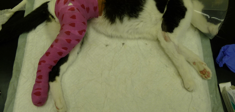 A tak sa začal dlhý proces terapie, kedy sme sa v prvej fáze snažili, čo najšetrnejšie odstrániť odumretú kožu a urýchliť tvorbu novej pomocou pravidelného čistenia rán s následnou aplikáciou mastí na popáleniny s hojacim účinkom. Fluffymu boli každý deň podávané celkové antibiotika na zamädzenie komplikácií pri hojení v podobe sekundárnej bakteriálnej infekcie a nesteroidné antiflogystiká, ktoré mu uľavili od bolesti. Najnepríjemnejšou súčasťou terapie bolo pre pacienta bandážovanie popálenej končatiny, ktoré podstupoval každý druhý deň. Prvé 4 preväzy náš pacient absolvoval v sedácií, kvôli veľkej bolestivosti.